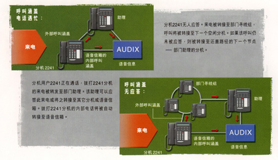 當(dāng)最初的被叫方不能接聽來話時,呼叫涵蓋功能可將來話轉(zhuǎn)接到另外一個分機。您可以自行規(guī)定判斷是否轉(zhuǎn)接的標(biāo)準(zhǔn)以及涵蓋通道的條件,如無應(yīng)答、 無此號碼、遇忙籌。DEFINITY BCS還可以識別內(nèi)部和外部呼叫,并為其提供不同的涵蓋通道。