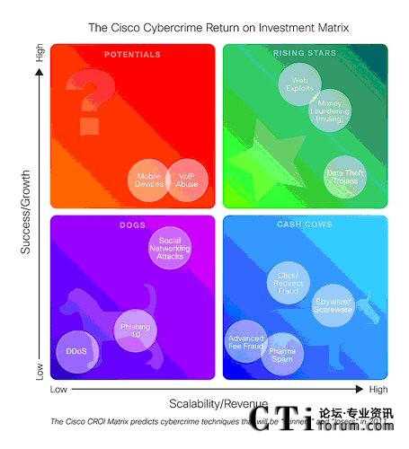 思科網(wǎng)絡(luò)犯罪投資回報(bào)(CROI)矩陣:在《思科2009年年網(wǎng)絡(luò)安全報(bào)告》中首次推出的思科CROI矩陣模型根據(jù)思科安全人士對(duì)尋求利益的犯罪者將使用的各種手段的預(yù)測(cè),分析了2011年各種犯罪的類型。該矩陣根據(jù)2010年的表現(xiàn),預(yù)計(jì)如Zeus等竊取數(shù)據(jù)的木馬,易于部署的網(wǎng)絡(luò)釣魚,以及錢騾將會(huì)是2011年主要的犯罪形式!坝写疾臁钡馁嶅X工具包括手機(jī)惡意軟件—木馬如今已經(jīng)存在于SymbOS和Zitmo.Altr手機(jī)平臺(tái)中(Zitmo就是指手機(jī)中的Zeus)。另一方面,盡管社交網(wǎng)絡(luò)在去年《年度報(bào)告》潛在因素目錄中排名靠前,2011年它將不再是為網(wǎng)絡(luò)犯罪創(chuàng)造機(jī)會(huì)的重要途徑。不過這也并不意味著社交網(wǎng)絡(luò)詐騙將有所減少,它們僅僅是如Zeus木馬等惡意網(wǎng)站欺詐行為的一個(gè)小的環(huán)節(jié)。