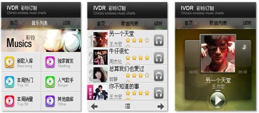 6)彩鈴定制業(yè)務(wù)。傳統(tǒng)彩鈴定制業(yè)務(wù)基于純語音IVR的環(huán)境下使用起來非常繁瑣,進(jìn)行彩鈴檢索比較麻煩,選擇的準(zhǔn)確度也很低。手機(jī)客戶端軟件的應(yīng)用,提供了可視化的交互方式,讓業(yè)務(wù)使用起來直觀便捷很多。用戶通過聲動(dòng)魅力完成彩鈴信息的瀏覽、試聽、定制過程,用戶可以邊瀏歌曲的同時(shí)邊聽到語音對(duì)歌曲的介紹,并可試用該歌曲。下圖即為彩鈴定制業(yè)務(wù)操作界面: