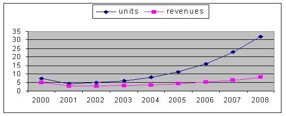 圖2、2000年至2008年全球視頻會(huì)議桌面系統(tǒng)市場(chǎng):數(shù)量與收入預(yù)測(cè)