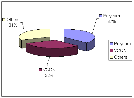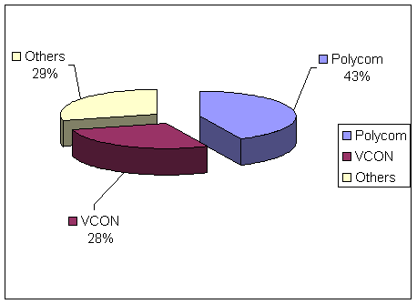 表4和圖3顯示了2001年桌面視頻會(huì)議市場(chǎng)競(jìng)爭(zhēng)廠商銷售額市場(chǎng)份額,表2和圖2顯示了銷售量的市場(chǎng)份額。隨著新產(chǎn)品的和新廠商的進(jìn)入,競(jìng)爭(zhēng)態(tài)勢(shì)將在未來不斷變化。目前該市場(chǎng)上兩個(gè)最大的廠商是Polycom和VCON, 其他一些小廠商市場(chǎng)份額較小。