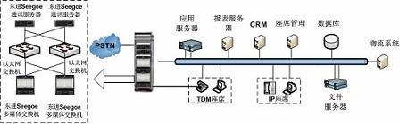 系統(tǒng)整體采用集中式架構(gòu),呼叫中心平臺采用東進公司基于Yessoe技術(shù)開發(fā)的Seegoe多媒體交換機和Seegoe通信服務(wù)器。呼叫中心平臺與物流公司內(nèi)部的物流管理系統(tǒng)(如LM、SCM)通過TCP/IP進行結(jié)合。呼叫中心系統(tǒng)具有豐富的媒體資源和強大的處理能力,并提供功能模塊的N+1全冗余備份,滿足了高負(fù)荷、大并發(fā)和關(guān)鍵業(yè)務(wù)的可靠運營。其次,Seegoe呼叫中心平臺在媒體交換層以全新的IP架構(gòu)實現(xiàn)網(wǎng)絡(luò)融合、應(yīng)用融合和業(yè)務(wù)融合,能夠很好的滿足電視購物行業(yè)對呼叫中心的要求。