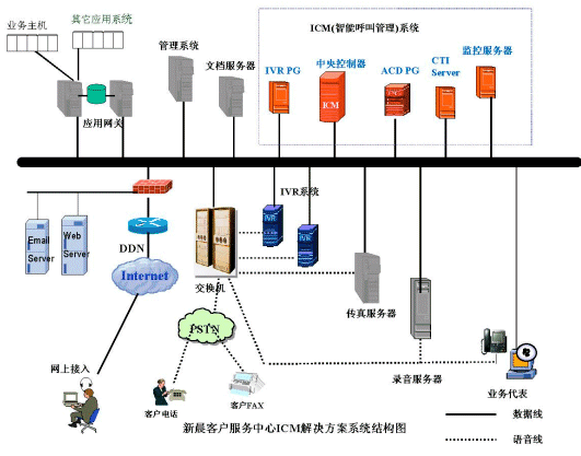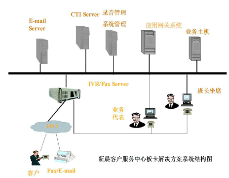 新晨客戶(hù)服務(wù)中心普及型解決方案是在以專(zhuān)用交換機(jī)或PC服務(wù)器加語(yǔ)音卡作為電話(huà)接入設(shè)備,如果用PC服務(wù)器加語(yǔ)音卡作為電話(huà)接入設(shè)備,將電話(huà)中繼線(xiàn)直接接到IVR上。此方案中的CTI系統(tǒng)能夠適用于流行的語(yǔ)音板卡和多種電話(huà)交換機(jī)的不同環(huán)境,這種解決方案主要針對(duì)小型的客戶(hù)服務(wù)中心推出。
