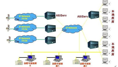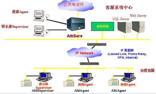這種組合節(jié)省管理成本,因?yàn)樗械淖瘑T都在一點(diǎn),便于管理控制,同時(shí)用戶(hù)只要撥打本地電話(huà)即可進(jìn)入系統(tǒng)接收服務(wù),如需人工座席應(yīng)答的話(huà)系統(tǒng)會(huì)自動(dòng)將來(lái)電通過(guò)Internet轉(zhuǎn)接到座席員處,對(duì)公司的話(huà)費(fèi)成本也較低(都是通過(guò)Internet實(shí)現(xiàn)的長(zhǎng)途轉(zhuǎn)接功能)。同時(shí)AltiGen也支持通過(guò)IP分機(jī)的方式遠(yuǎn)程登錄到系統(tǒng)實(shí)現(xiàn)遠(yuǎn)程座席的功能,這樣對(duì)有些高級(jí)話(huà)務(wù)員或?qū)<易,不必每天到公司上班,可以通過(guò)家里的電腦登錄到AltiGen系統(tǒng),作為系統(tǒng)的一個(gè)分機(jī)來(lái)完成所有的座席員的功能,在他的電腦屏幕上也能彈出來(lái)電人的信息。系統(tǒng)的組網(wǎng)圖如下: