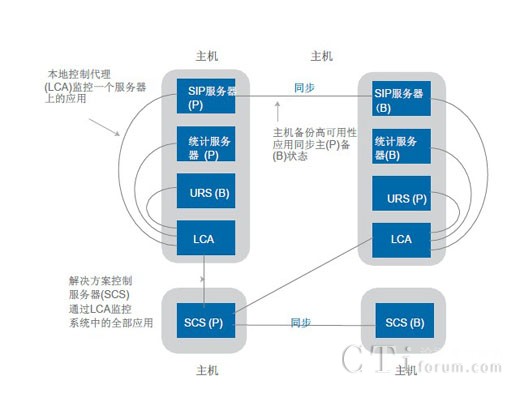 除了提供多個(gè)解決方案組件級的高可用性之外,高可用性功能也被融入到了管理框架中。圖4作為假設(shè)系統(tǒng)配置顯示了Genesys系統(tǒng)中高可用性管理的幾個(gè)重要方面。通過此類架構(gòu),解決方案控制服務(wù)器(SCS)管理著系統(tǒng)中所有Genesys組件的服務(wù)狀態(tài),包括啟動(dòng)和停止組件以及管理它們的高可用性主/備狀態(tài)等。SCS與本地控制代理(LCA)的多個(gè)實(shí)例共同運(yùn)行。每個(gè)物理主機(jī)上面都安裝有LCA的一個(gè)實(shí)例,用于在SCS與主機(jī)上面安裝的單個(gè)組件之間提供接口。