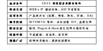 CESS消費型服務(wù)軟件具有經(jīng)濟實惠、選擇多樣、簡單快捷、配套自選、綠能環(huán)通路廣泛等特點,采用Web+IP的潮流科技,AIO節(jié)省投資,使軟件經(jīng)濟實惠;CESS軟件產(chǎn)品線齊全,涵蓋客服、銷售、財務(wù)、行政、OA等很多方面,給您多樣選擇;WYSIWYG(所見即所得)導向,業(yè)務(wù)流程DIY,讓您至需要動動鼠標就可以DIY您想要得到的設(shè)計,不再需要麻煩IT人員,只管實用,簡單快捷;輕松Plug-in & Hook其它應(yīng)用與通信環(huán)境,可根據(jù)您的需要配套自選;節(jié)能減碳、省話費、省空間,綠色環(huán)保;經(jīng)銷體系健全、提供優(yōu)質(zhì)服務(wù),通路廣泛。