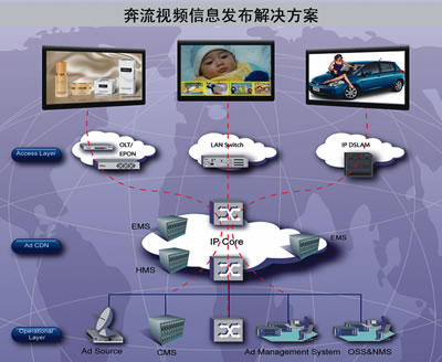 UT斯達康緊跟市場發(fā)展趨勢和運營商步伐,深入研究戶外液晶廣告業(yè)務的發(fā)展、大力推進廣告平臺的研發(fā)。2006年,UT斯達康推出了奔流(RollingStream)視頻信息發(fā)布解決方案(如圖2所示)。奔流視頻信息發(fā)布解決方案是以奔流(RollingStream)IPTV平臺為基礎(chǔ),結(jié)合戶外液晶廣告市場需求,融合運營商以視頻為主的綜合信息發(fā)布的需求,真正運營級的電信級解決方案。該方案可以幫助運營商實現(xiàn)融合信息服務和廣告業(yè)務的統(tǒng)一運營,幫助運營商開展兼具公益性和盈利性的信息發(fā)布業(yè)務,運營商在推進社會信息化、造福公眾的同時,通過視頻廣告的運營,也能獲取盈利。該方案基于電信級平臺的穩(wěn)定性、安全性、擴展性設(shè)計要求,可支持百萬級大規(guī)模部署能力,可提供電信級質(zhì)量保證的服務;該方案基于IP流媒體技術(shù),可通過IP網(wǎng)絡實時、精準、互動地投放廣告內(nèi)容,從而可以支持豐富、新穎的廣告運營模式;該方案基于數(shù)字多媒體技術(shù),除了可以發(fā)布視頻廣告,還可以發(fā)布圖片、文字、消息等廣告內(nèi)容。