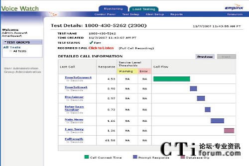 電話交易監(jiān)測: 一個電話交易由一條指定的路由組成,呼叫者穿越這條路由,通過按鍵或語音完成一項自助服務的交易。對于每一個通話路由,Voice Watch被設計成通過撥號或者語音指定這條路由完成一項IVR自助服務的交易,例如賬戶余額檢查,賬單支付等。電話交易監(jiān)測管理自助服務的可用性和性能,也測量承載網(wǎng)的性能和交換機、IVR、語音識別和主機/數(shù)據(jù)庫的響應時間。