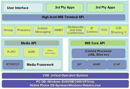 高陽IMS軟終端產(chǎn)品線是基于IMS(IP多媒體子系統(tǒng))技術(shù),以通信終端功能為主,融入IT特性,將在線狀態(tài)、即時消息和群組管理融為一體,集合語音、數(shù)據(jù)、視頻通信,提供統(tǒng)一的用戶體驗,實現(xiàn)移動電話、PC之間的互聯(lián)互通,并且符合3GPP/ETSI/OMA/IETF/ITU-T等國際標準組織和中國電信/中國移動規(guī)定的IMS相關(guān)規(guī)范。