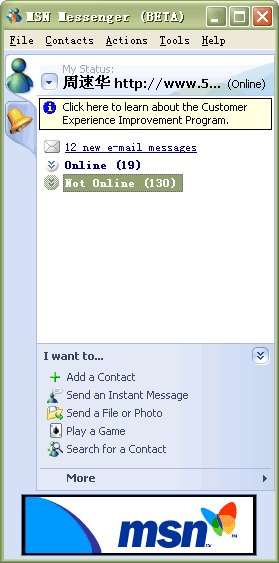 5月26日,微軟最新即時通訊軟件MSN Messenger的最新版本MSN Messenger Beta 6.0.0250被提前遭遇外泄,使得大家提前領(lǐng)略到了微軟最新的即時通訊軟件風采。這也是微軟.net計劃中的一個重要組成部分,也讓我們看到了一些微軟“格林威治(Greenwich)”的影子!案窳滞(Greenwich)”――是微軟基于.net戰(zhàn)略的能夠?qū)崟r進行通信等的服務(wù)器軟件的開發(fā)代號。由于未對外正式發(fā)布,此次公開的是MSN