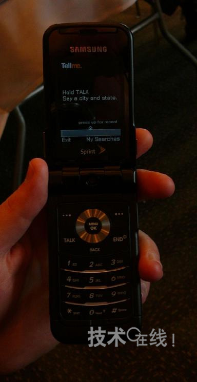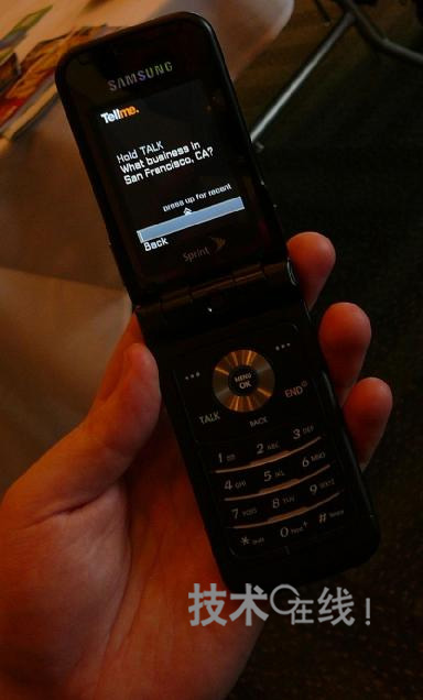 使用Tellme by Mobile檢索店鋪等時(shí)的畫(huà)面。首先,用戶可按著通話鍵說(shuō)出自己所在的町和州的名字。