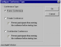 TeleConference系統(tǒng)內(nèi)的任一個(gè)分機(jī),都可以利用瀏覽器(Internet Browser)來(lái)預(yù)約會(huì)議時(shí)間,而參加會(huì)議的人可以在會(huì)議開(kāi)始時(shí),自動(dòng)打電話進(jìn)系統(tǒng)參加會(huì)議就像加入“聊天室“一樣簡(jiǎn)單。