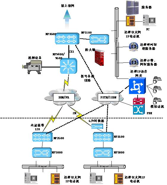 目前許多公安系統(tǒng)雖然采用具有IP語音功能的路由設(shè)備組建網(wǎng)絡(luò),但在業(yè)務(wù)語音交流通常還通過PBX集團交換機走電信PSTN/ISDN電話網(wǎng),這樣無法節(jié)省電話費用,反而增加了辦公費用。邁普IP語音解決方案采用了邁普MyPower VG2000IP語音網(wǎng)關(guān)和邁普以太網(wǎng)IP電話進行改造。在整個網(wǎng)點語音終端全部設(shè)備選用經(jīng)濟型邁普以太網(wǎng)IP電話機,它采用雙以太口設(shè)計,使網(wǎng)絡(luò)無需重新布線,同時也可使用已有的路由器上IP語音模塊;邁普以太網(wǎng)IP電話機之間的話音通信通過邁普呼叫管理服務(wù)器集中控制。在主體IP網(wǎng)絡(luò)中,邁普IP語音網(wǎng)關(guān)放置于中心機房作為傳統(tǒng)PSTN的出口,可以通過VOS接口、E1接口(中國一號信令)、E&M接口等多種方式接入公安PBX,將PSTN線路傳來的時分話音或傳真信息進行分組和壓縮,轉(zhuǎn)換成IP數(shù)據(jù)包,通過路由設(shè)備路由到目的地;在沒有PBX的公安機房,邁普IP語音網(wǎng)關(guān)可以提供32路的模擬用戶接口,可以完全替代傳統(tǒng)PBX并接入PSTN,并提供額外功能,如圖中虛線所示;整個方案還可以針對公安用戶特殊需求"定做"特色功能,例如緊急告警等方便日常辦公。