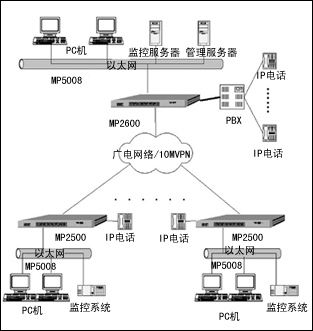 各分店用一臺MP2500路由器,配雙以太口,一個口接MP5008交換機組建本地以太網(wǎng),一個口接廣電的10MVPN,以實現(xiàn)本地以太網(wǎng)與總店、各分店、配送中心等連接。配1個RM2-1VoIP單路IP電話模塊,直接下掛普通電話機,以實現(xiàn)全網(wǎng)IP電話免費,同時還可以通過總店的程控交換機與市話連接。分店以太網(wǎng)中,掛有監(jiān)控系統(tǒng)、PC機、醫(yī)保讀卡器等。模塊化設(shè)計提供了網(wǎng)絡(luò)擴展的空間,滿足未來業(yè)務(wù)的發(fā)展。邁普的路由器提供多種模塊,用戶可以根據(jù)實際需要加裝不同的模塊,滿足不同環(huán)境的使用要求。模塊化設(shè)計可以極大地方便設(shè)備的維護,并為今后的網(wǎng)絡(luò)升級改造提供足夠的預(yù)留空間。