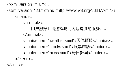 下面是一個(gè)VoiceXML的簡(jiǎn)單例子。當(dāng)用戶與電話語(yǔ)音系統(tǒng)接通以后,將會(huì)聽(tīng)到語(yǔ)音合成的提示信息"用戶您好!請(qǐng)選擇我們?yōu)槟峁┑姆⻊?wù):"。當(dāng)用戶說(shuō)"股票市場(chǎng)",語(yǔ)音瀏覽器就會(huì)通過(guò)語(yǔ)音識(shí)別功能識(shí)別用戶的選擇,然后把對(duì)話流程轉(zhuǎn)向另一個(gè)VoiceXML腳本文件stocks.vxml。stocks.vxml腳本文件則是一個(gè)專(zhuān)門(mén)向用戶提供股票市場(chǎng)相關(guān)服務(wù)的語(yǔ)音網(wǎng)頁(yè)。
