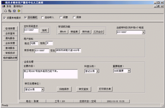 客戶打入電話后,當(dāng)系統(tǒng)的自動(dòng)語音應(yīng)答子系統(tǒng)無法解決納稅人問題時(shí),客戶可選擇人工服務(wù),由客戶服務(wù)代表直接接聽納稅人電話,處理并解決納稅人問題。此時(shí)納稅人同座席話務(wù)人員直接溝通,并同時(shí)記錄下該客戶的聯(lián)系方式,將相關(guān)數(shù)據(jù)添加入系統(tǒng)數(shù)據(jù)庫;也可以在數(shù)據(jù)庫的支持下回答國家和地方的稅收政策及相關(guān)規(guī)定等的咨詢和疑問?蛻粢部梢赃x擇自動(dòng)語音服務(wù)方式,根據(jù)系統(tǒng)的語音提示輸入按鍵,選擇類別,將自己的投訴和建議以及自己的聯(lián)系方式信息以留言錄音的方式保存在系統(tǒng)中。系統(tǒng)同時(shí)還支持自動(dòng)傳真方式,客戶可以通過傳真機(jī)進(jìn)入本系統(tǒng),通過按鍵選擇傳真方式,將自己的意見建議等的文本內(nèi)容傳真給系統(tǒng),系統(tǒng)自動(dòng)接受并存入數(shù)據(jù)庫。