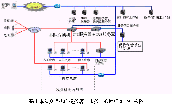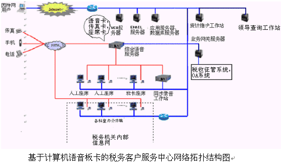對(duì)于20個(gè)以下人工座席的中小型稅務(wù)客戶服務(wù)中心系統(tǒng),則建議使用基于計(jì)算機(jī)語音板卡的方式,可以減少投資,同時(shí)具有良好的系統(tǒng)性能;對(duì)于大型的稅務(wù)客戶服務(wù)中心系統(tǒng),可選用排隊(duì)交換機(jī)作為語音接入設(shè)備,以保障系統(tǒng)的高可靠性和穩(wěn)定性;大大提高了系統(tǒng)的適應(yīng)面。