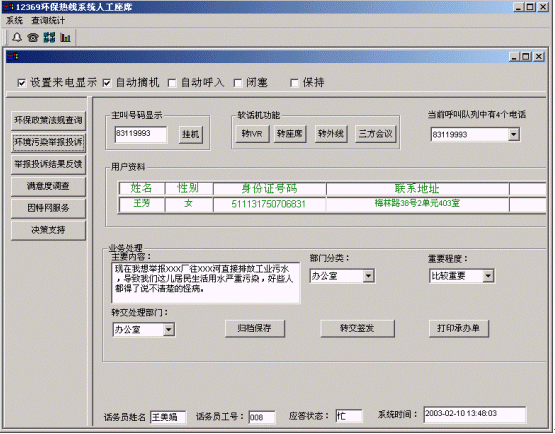 12369環(huán)保熱線系統(tǒng)將接入功能、導(dǎo)航功能、自動(dòng)語音查詢功能、人工座席服務(wù)功能、話路轉(zhuǎn)接功能、信息資料處理緊密聯(lián)系起來。用戶撥打特服電話號(hào)碼后,可以根據(jù)需要選擇人工服務(wù)、自動(dòng)語音查詢、自動(dòng)留言,并能夠在幾種服務(wù)中來回切換或轉(zhuǎn)接其它電話;所記錄的資料可以分門別類的進(jìn)行統(tǒng)計(jì)并形成報(bào)表,供相關(guān)部門進(jìn)行檢索查閱;意見處理完畢,可由座席主動(dòng)呼叫用戶,告知處理意見,形成閉環(huán)處理流程。