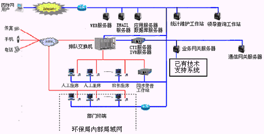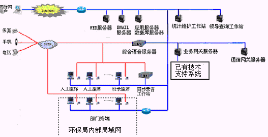 該12369環(huán)保熱線系統(tǒng)主要是由具有排隊(duì)功能的交換機(jī)或帶語音板卡的工控機(jī)、CTI服務(wù)器、IVR(交互式語音應(yīng)答)/IFR(交互式傳真應(yīng)答)子系統(tǒng)、人工座席子系統(tǒng)、應(yīng)用服務(wù)器、數(shù)據(jù)庫服務(wù)器、業(yè)務(wù)網(wǎng)關(guān)子系統(tǒng)、通信網(wǎng)關(guān)子系統(tǒng)等硬件設(shè)備和應(yīng)用軟件組成。