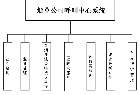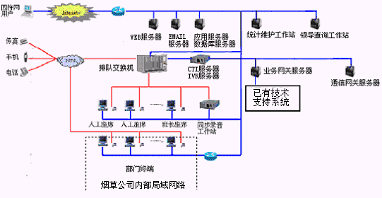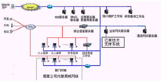 卷煙經銷戶等客戶利用電話、傳真、電子郵件、因特網、手機、短消息等撥打統一的特服號碼(如800XXX或9XXXX)進入煙草公司呼叫中心,本系統依托煙草公司各類業(yè)務技術支持系統和網絡系統,實現煙草專賣局原有管理系統/業(yè)務系統及數據庫的無縫連接,通過人工受理或自動語音服務等方式全天24小時不間斷地為客戶提供各種服務。