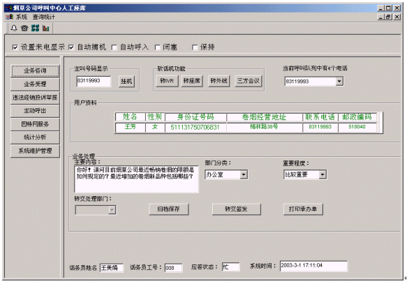 煙草公司呼叫中心將接入功能、導航功能、自動語音查詢功能、人工座席服務功能、話路轉接功能、信息資料處理緊密聯系起來。用戶撥打特服電話號碼后,可以根據需要選擇人工服務、自動語音查詢、自動留言,并能夠在幾種服務中來回切換或轉接其它電話;所記錄的資料可以分門別類的進行統計并形成報表,供相關部門進行檢索查閱;意見處理完畢,可由座席主動呼叫用戶,告知處理意見,形成閉環(huán)處理流程。