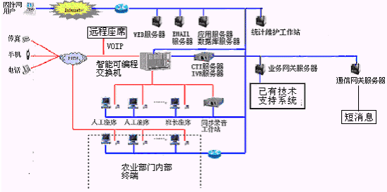 農(nóng)業(yè)分布式呼叫中心系統(tǒng)是利用當(dāng)代信息技術(shù),尤其是以計(jì)算機(jī)電信集成(CTI)為核心的呼叫中心(CALL CENTER) 技術(shù),建立分布式呼叫中心系統(tǒng);它可以作為連接廣大客戶(hù)和農(nóng)業(yè)部門(mén)的橋梁,是農(nóng)業(yè)部門(mén)管理窗口的延伸和對(duì)客戶(hù)進(jìn)行電子化服務(wù)的門(mén)戶(hù)。