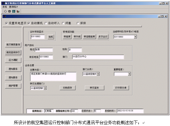 航空集團運行控制部門分布式通訊平臺系統(tǒng)的軟件設計采用業(yè)界先進的三層CLIENT/SERVER體系結構,集目前先進的計算機技術、通信技術、計算機電信集成(CTI)技術、呼叫接入技術、智能接入交換分配技術、數(shù)字語音處理技術、異構系統(tǒng)信息交互技術、安全容錯技術、網(wǎng)絡組網(wǎng)技術等于一體,并與航空集團運行控制部門已有技術支持系統(tǒng)(如飛行運行控制系統(tǒng)、航路計劃系統(tǒng))緊密結合在一起,突破時空的限制,通過人工座席、自動語音/傳真、相關部門工作人員等為集團內(nèi)部提供電話、傳真服務形式的周到、快捷、全方位的通信服務。