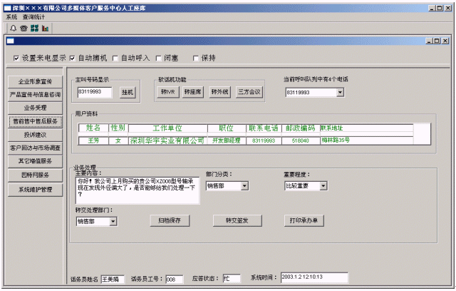 (2)提高家電企業(yè)親切感:系統(tǒng)在人工服務(wù)狀態(tài)下,當(dāng)業(yè)務(wù)代表輸入客戶名稱時(shí),系統(tǒng)即時(shí)將客戶與家電企業(yè)相關(guān)的信息顯示在座席終端上,使業(yè)務(wù)及時(shí)了解客戶,有針對(duì)性回答客戶問題,使客戶倍感親切。