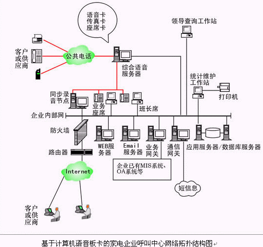 對(duì)于20個(gè)以下座席的中小型家電企業(yè)呼叫中心系統(tǒng),則建議使用基于計(jì)算機(jī)語(yǔ)音板卡的形式,可以減少家電企業(yè)投資,同時(shí)具有良好的系統(tǒng)性能;以確保合理的、較少的投入,獲取最佳的配置,滿足不同家電企業(yè)的需求。