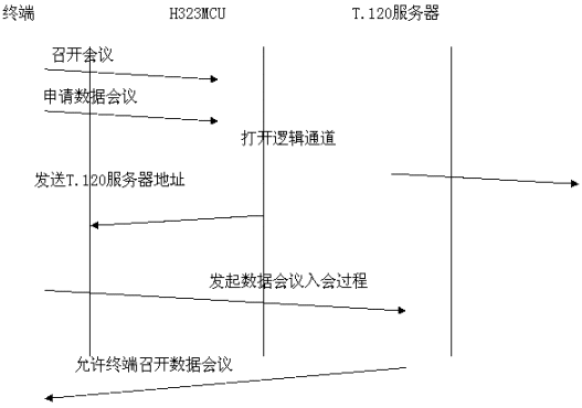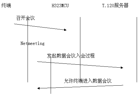 采用帶外方式,數(shù)據(jù)與音頻視頻流分開,各自占用帶寬。與終端和MCU無任何關系。如果用戶想召開數(shù)據(jù)會議,需要單獨的一臺PC機來進行數(shù)據(jù)的接受與傳送,所有需要數(shù)據(jù)會議功能的用戶的PC機都連接到一個T.120服務器上。目前常用的終端軟件是Netmeeting軟件。數(shù)據(jù)占用單獨的帶寬,不擠占音視頻的帶寬。會議建立過程為: