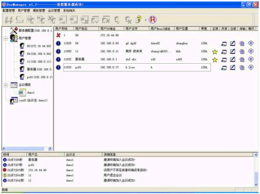 簡單方便的用戶管理,可以增加用戶、修改用戶信息、刪除用戶等。在會議中可以實時地檢測和顯示用戶的網(wǎng)絡狀態(tài)。