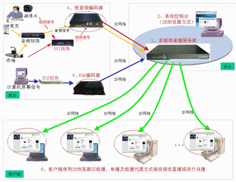 通過服務(wù)器內(nèi)置單播或組播功能方式將會議現(xiàn)場的視頻、音頻、計(jì)算機(jī)屏幕上的圖像內(nèi)容和過程在網(wǎng)絡(luò)上進(jìn)行實(shí)時(shí)直播,用戶可通過IE瀏覽器登錄服務(wù)器實(shí)時(shí)接收會議現(xiàn)場的視頻、音頻和計(jì)算機(jī)動態(tài)屏幕內(nèi)容,也可以選擇性的直播部分媒體流,直播延時(shí)小。同時(shí)系統(tǒng)獨(dú)家支持組播代理功能,無須更改網(wǎng)絡(luò)設(shè)備設(shè)置的即可實(shí)現(xiàn)跨網(wǎng)段的組播。