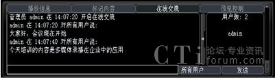系統(tǒng)增加了多方文字互動交流功能,在線交流功能可以選擇給所有人員發(fā)送消息,也可以選擇給某一特定人員發(fā)送。這樣在會議或培訓的過程中,管理員可以選擇性的提出相應(yīng)的問題給相關(guān)人員,考核相關(guān)人員的培訓效果;其他人員也可以將會議或培訓過程中遇到的疑問、難點及時的反應(yīng)給管理員進行解答,增強會議或培訓的成效。