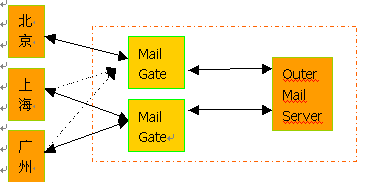 1. 正常工作時北京的內部郵件服務器通過Mail Gate 1與外部郵件服務器通訊,上海、廣州通過 Mail Gate 2與外部郵件服務器通訊;