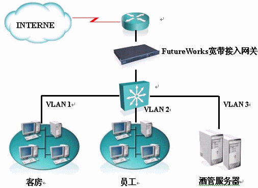 FutureWorks寬帶計(jì)費(fèi)系統(tǒng)針對南京大飯店上網(wǎng)計(jì)費(fèi)的解決方案結(jié)構(gòu)圖