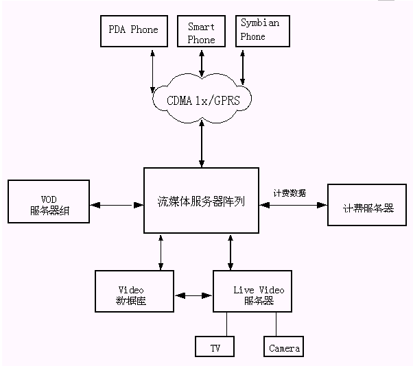 根據(jù)中國2.5網(wǎng)絡(luò)的特點(diǎn),結(jié)合我們自身的技術(shù)和系統(tǒng)解決方案的優(yōu)勢,我們針對CDMA1X網(wǎng)絡(luò)推出了移動VOD,增強(qiáng)型移動視頻郵件、移動可視電話的系統(tǒng)解決方案。在GPRS網(wǎng)絡(luò)上則推出了移動音頻點(diǎn)播業(yè)務(wù),移動視頻郵件業(yè)務(wù)。下面我們對這些業(yè)務(wù)做具體描述。