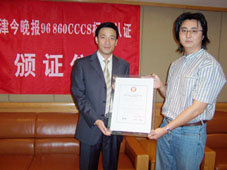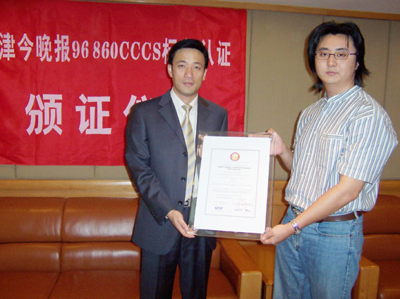2004年9月9日,天津今晚報(bào)公眾服務(wù)中心通過(guò)了《全國(guó)呼叫中心運(yùn)營(yíng)績(jī)效標(biāo)準(zhǔn)》(CCCS-OP-2003)認(rèn)證,并獲得由中國(guó)信息化推進(jìn)聯(lián)盟客戶關(guān)系管理專業(yè)委員會(huì)頒發(fā)的認(rèn)證證書(shū)(四星級(jí)客戶服務(wù)中心),成為國(guó)內(nèi)傳媒業(yè)首家通過(guò)此認(rèn)證的呼叫中心。