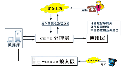 (1)接入層:主要負(fù)責(zé)公網(wǎng)(固定網(wǎng)、移動網(wǎng)、互聯(lián)網(wǎng))與系統(tǒng)相接的部分,處理電話呼入/呼出的信令、話路的交換;互聯(lián)網(wǎng)的接入、數(shù)據(jù)的處理。