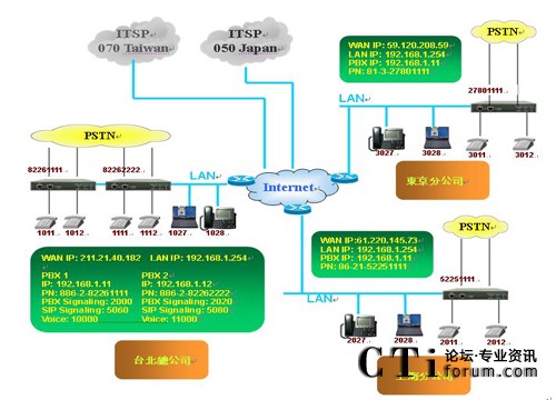 在上圖的架構(gòu)中,各點皆使用MOSA 4604A Plus,皆為2個FXS、2個FXO、4個SIP外線及30個SIP分機的型號,F(xiàn)XO接在當(dāng)?shù)氐腜STN(公眾交換電信網(wǎng)絡(luò))上,F(xiàn)XS則接在一般的話機上,另各有30的SIP分機可供其它SIP設(shè)備(如SIP