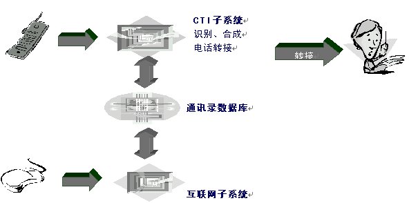 Internet子模塊相對比較簡單,可以采用目前主流的網(wǎng)絡(luò)通訊錄服務(wù)方式進(jìn)行服務(wù);而為了更好服務(wù)用戶,CTI子模塊需要采用先進(jìn)的語音合成和語音識別技術(shù)。