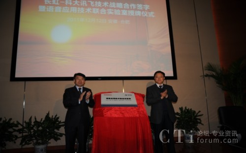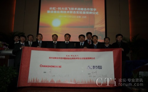 CTI論壇(ctiforum)12月14消息(記者 潘婷婷): 12月12日,科大訊飛與長虹集團(tuán)戰(zhàn)略合作簽約暨共建聯(lián)合實(shí)驗(yàn)室揭牌儀式在科大訊飛語音產(chǎn)業(yè)基地研發(fā)大樓隆重舉行。根據(jù)合作框架協(xié)議,雙方將在戰(zhàn)略聯(lián)盟的基礎(chǔ)上,以共建聯(lián)合實(shí)驗(yàn)室為主要載體,旨在依托各自行業(yè)領(lǐng)域的長期積淀優(yōu)勢、強(qiáng)強(qiáng)聯(lián)合,達(dá)成戰(zhàn)略互信,加強(qiáng)緊密合作,積極推動(dòng)“語音核心引擎+智能終端平臺(tái)” 的特色應(yīng)用模式,深入拓展智能語音科技在智能電視等終端產(chǎn)品市場的應(yīng)用范圍,合力開創(chuàng)智能語音終端創(chuàng)新應(yīng)用市場空間。