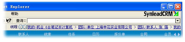 值得欣喜的是,部分CRM廠商意識到用戶迷路問題的嚴重性,并清楚IE瀏覽器具備的頁面歷史尋址(History Location)功能滿足不了頁面內數(shù)據(jù)庫復雜、動態(tài)歷史條件的記憶,必須另外打造屬于CRM應用程序自身的歷史堆棧。少許CRM軟件開始提供歷史“后退”、“前進”按鈕,SynleadCRM歷史精確度保持領先地位。