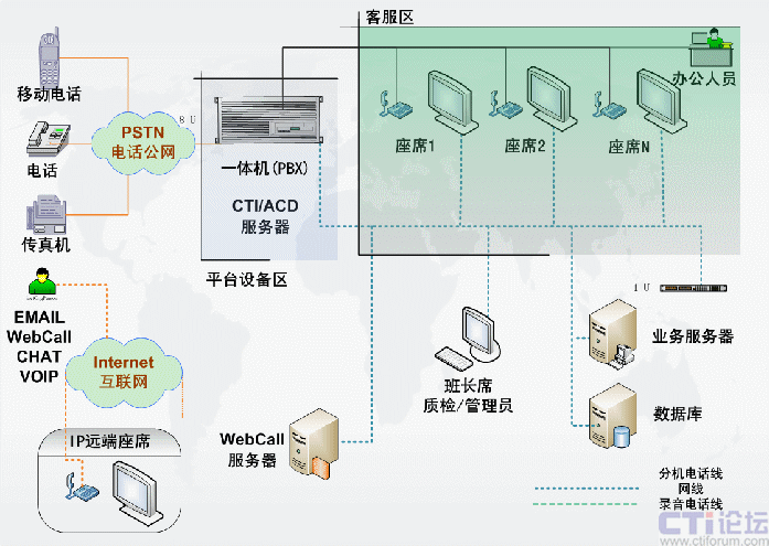 包含CTI服務器、IVR/FAX服務器、錄音監(jiān)控 系統(tǒng)、報表統(tǒng)計系統(tǒng),CRM客戶管理等。