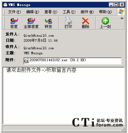 A、電子郵件檢索:語音留言可以以Email方式,發(fā)送到信箱主人的郵箱中,用戶可以使用Outlook、Foxmail或其它郵件方式,以附件方式收取個(gè)人的語音留言,通過PC上的揚(yáng)聲器、耳機(jī)來收聽消息。
