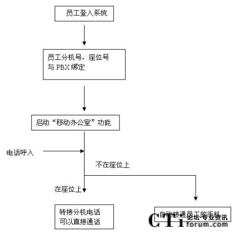 每個(gè)需要到企業(yè)辦公的員工,可以通過門禁系統(tǒng),或?qū)iT一臺(tái)PC上進(jìn)行登入,通過后由系統(tǒng)自動(dòng)分配或員工選擇一個(gè)空閑的座位,座位號與員工的分機(jī)號碼綁定,所有對這個(gè)員工分機(jī)的呼叫均被自動(dòng)轉(zhuǎn)移到其座位上的辦公電話上;
