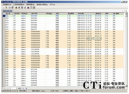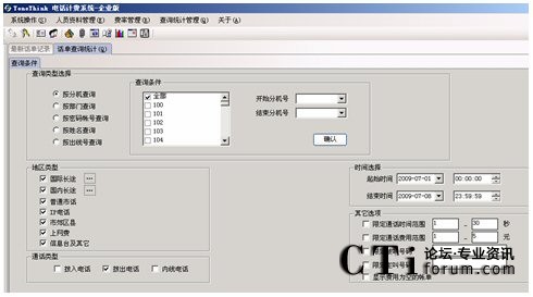 系統(tǒng)提供多種查詢條件,進(jìn)行話單明細(xì)和話單結(jié)算的統(tǒng)計(jì),如:按分機(jī)、部門、密碼、職員名稱、出現(xiàn)號碼、通話時(shí)間范圍、通話費(fèi)用范圍、制定主叫、制定被叫、不同的通話類型(國內(nèi)長途、國際長途、市話、IP等)。
