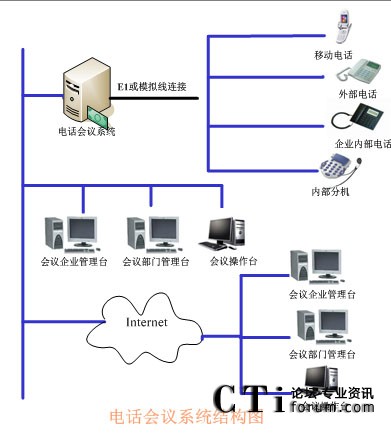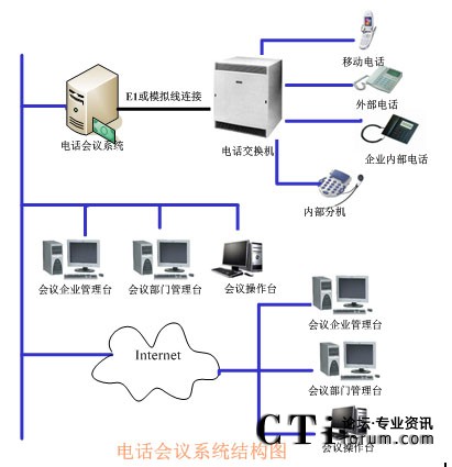 TalenTel CNF電話會(huì)議系統(tǒng)可以與程控交換機(jī)配合使用,也可以直接與局方的系統(tǒng)進(jìn)行連接,系統(tǒng)的構(gòu)成含如下幾部分:TalenTel CNF電話會(huì)議系統(tǒng)服務(wù)器(ctsIVR)、會(huì)議企業(yè)管理員模塊、會(huì)議部門管理員模塊、會(huì)議操作員管理模塊、數(shù)據(jù)庫等組成。