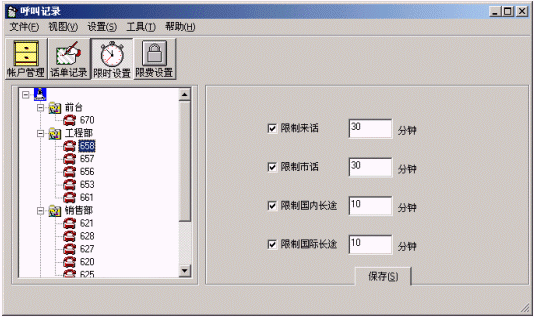 當(dāng)前,商路通實(shí)時(shí)計(jì)費(fèi)系統(tǒng)可以根據(jù)每一個(gè)分機(jī)、話務(wù)類型進(jìn)行實(shí)時(shí)控制?梢葬槍γ恳环N話務(wù)類型(來話、市話、國內(nèi)長途、國際長途)設(shè)置不同的通話時(shí)長限制,時(shí)間一到立刻拆掉。