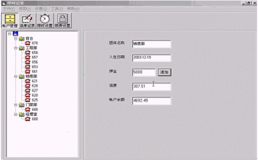 ·團(tuán)體限費(fèi)功能:多個(gè)分機(jī)組成一個(gè)團(tuán)體,針對團(tuán)體內(nèi)的每一個(gè)分機(jī)根據(jù)呼叫類型限制通話費(fèi)用,可以實(shí)現(xiàn)團(tuán)體的押金管理;