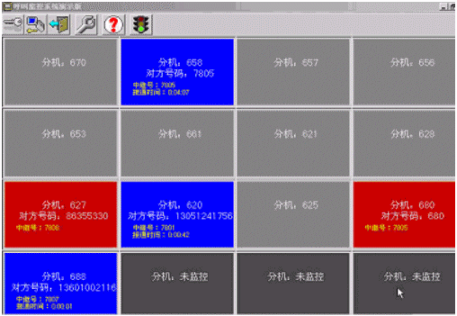 呼叫實(shí)時(shí)監(jiān)控功能實(shí)現(xiàn)了實(shí)時(shí)顯示每一個(gè)分機(jī)摘機(jī)、呼叫、通話掛機(jī)的狀態(tài),以便管理者實(shí)時(shí)、動態(tài)了解當(dāng)前內(nèi)部通信網(wǎng)絡(luò)的狀況和每一個(gè)分機(jī)或員工的工作狀態(tài)。